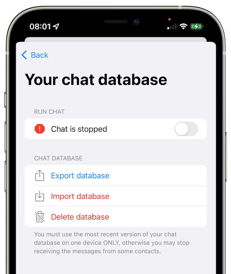 Quite a few users asked - how can I move my chat profile to a new device? SimpleX Chat v3 has a solution for that - you can now export chat database from one device and import it into another - even to another platform, e.g. you can move chat database from Android phone to iOS or to the terminal (console) client.