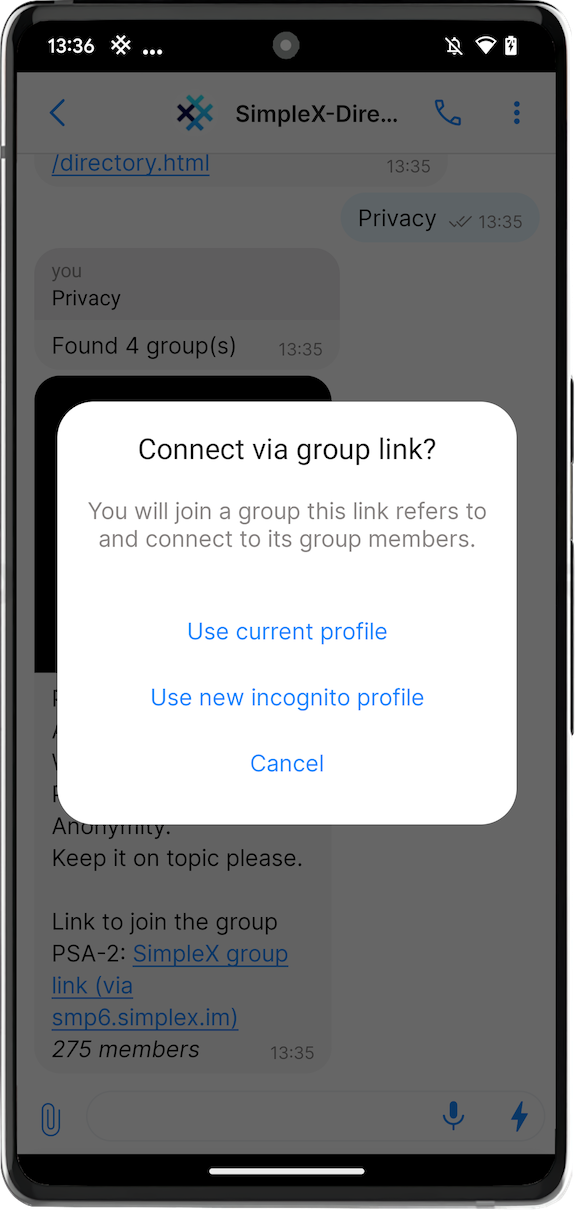 Directory service provides a way to search for public groups submitted by the users. To use it, you need to connect to it via SimpleX Chat, as you would connect to any other contact, and type some words to search.