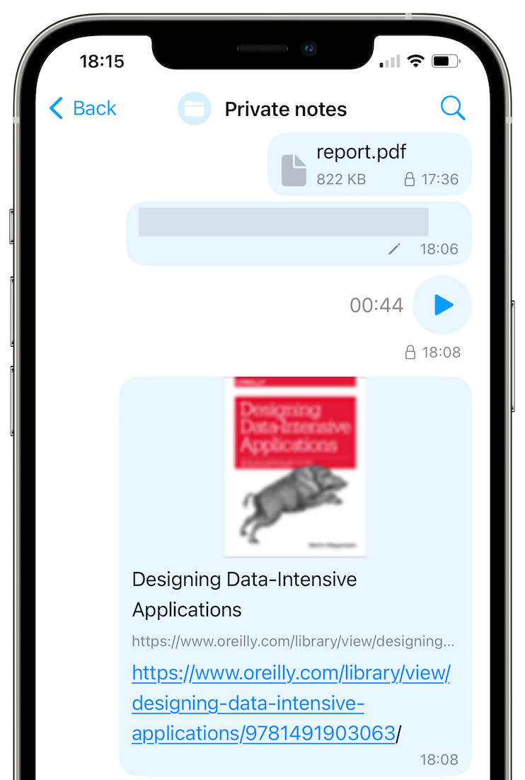 This version has a more convenient and private alternative - the Private notes. It looks like an ordinary conversation where you can put text messages, links with previews, and any media and files, but they are not sent anywhere - they are stored locally, only on your device, with encrypted files.